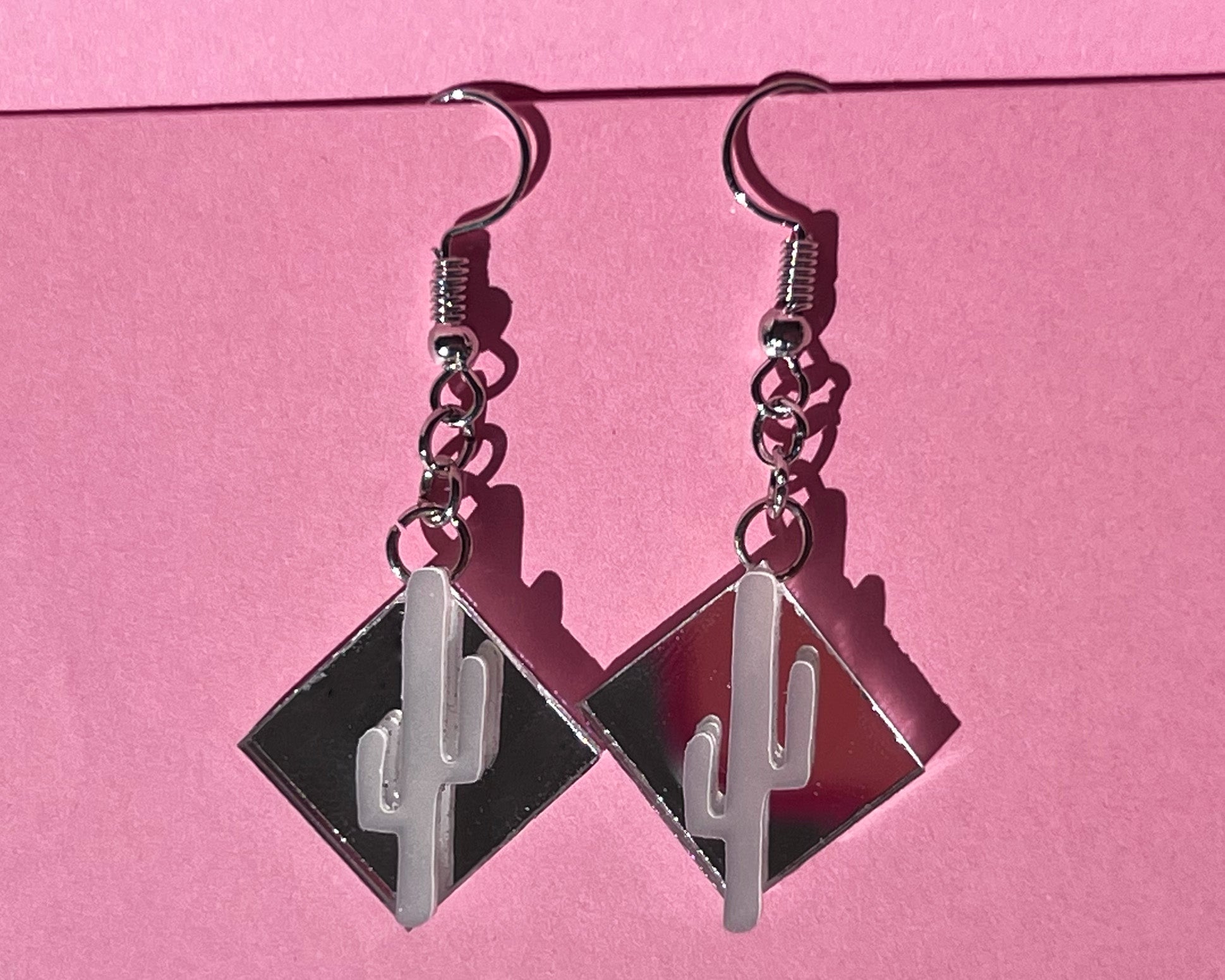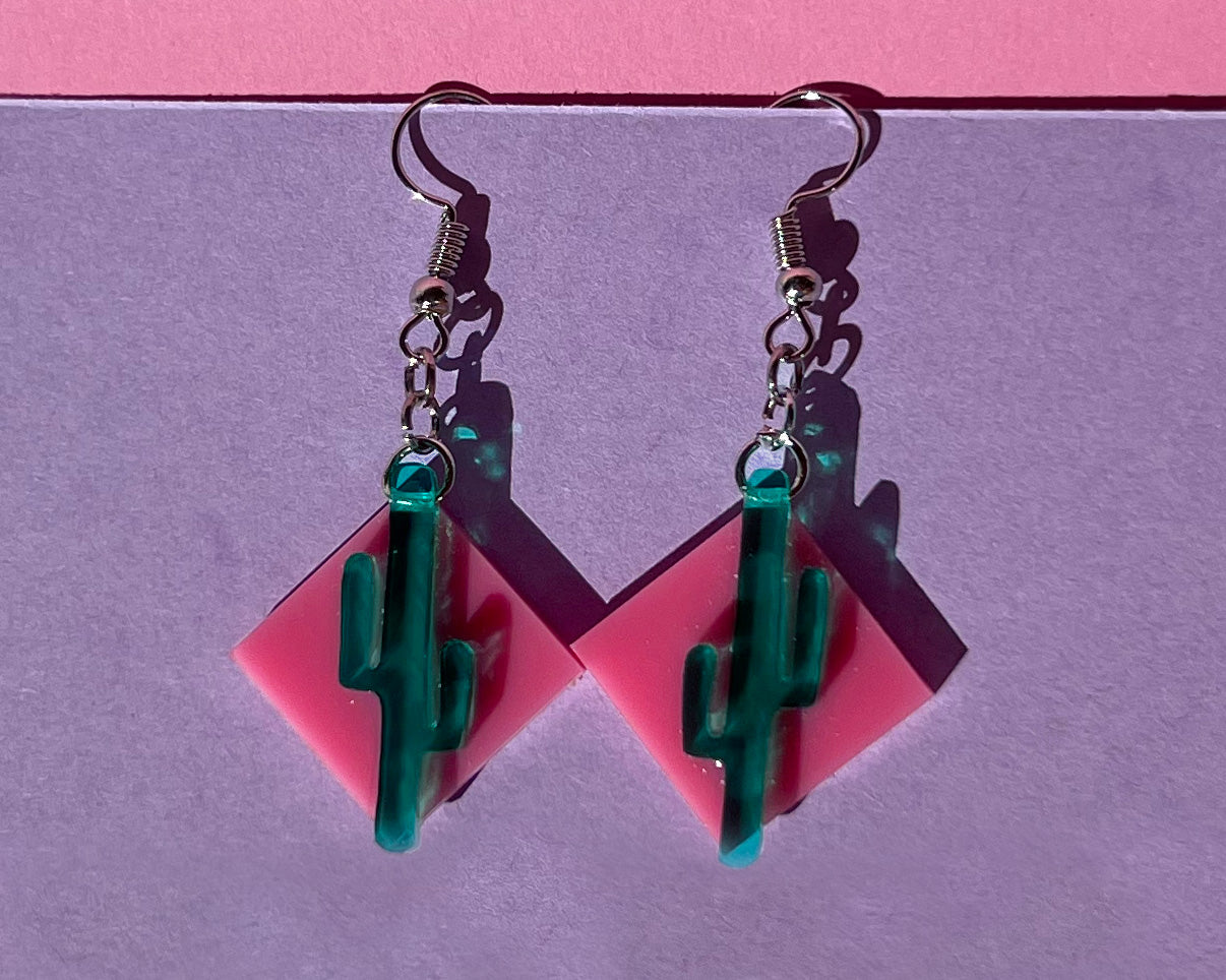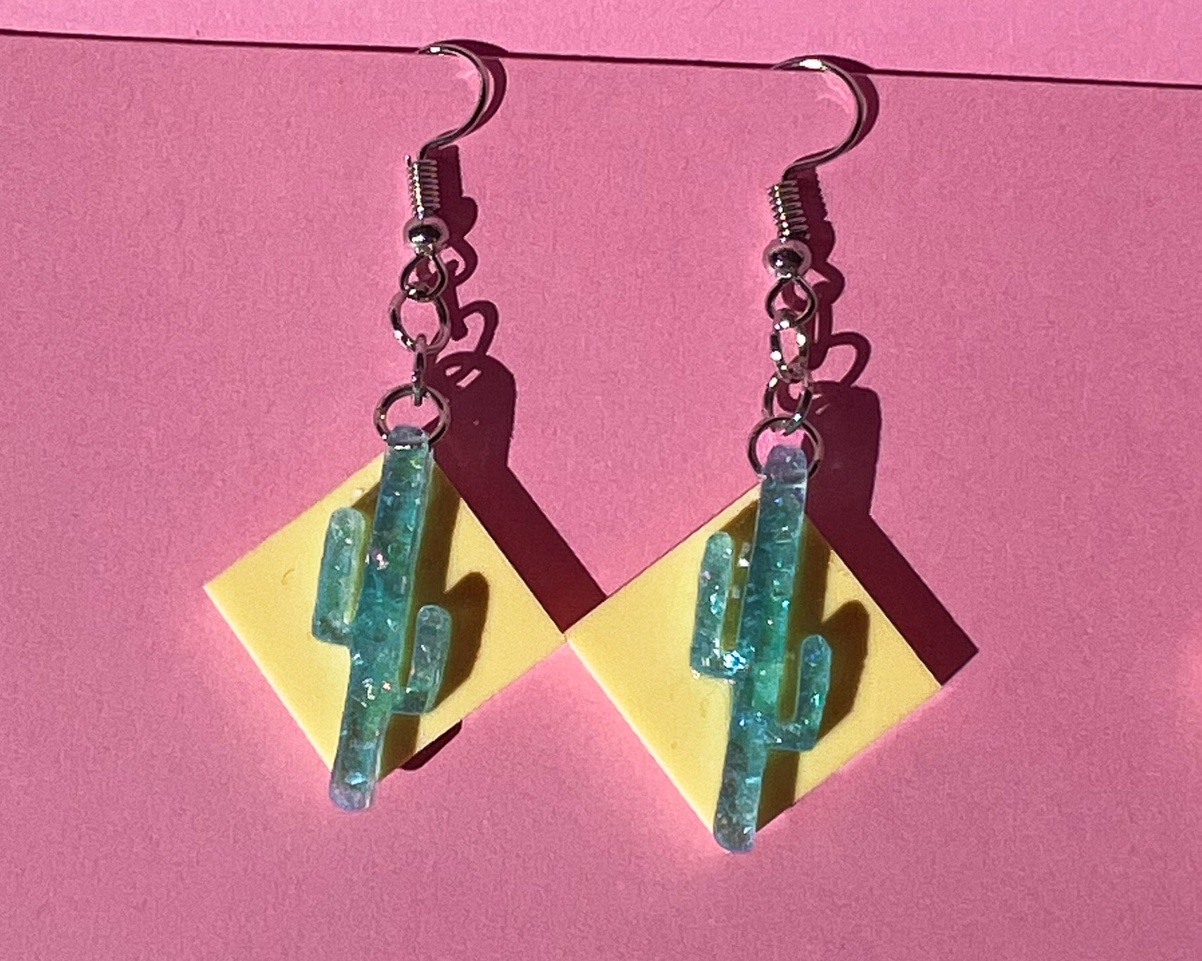 🌵 Layered lucite depicting a cactus with a sun or other sky element. Cacti are displayed on a mirrored or coloured or coloured translucent background.
