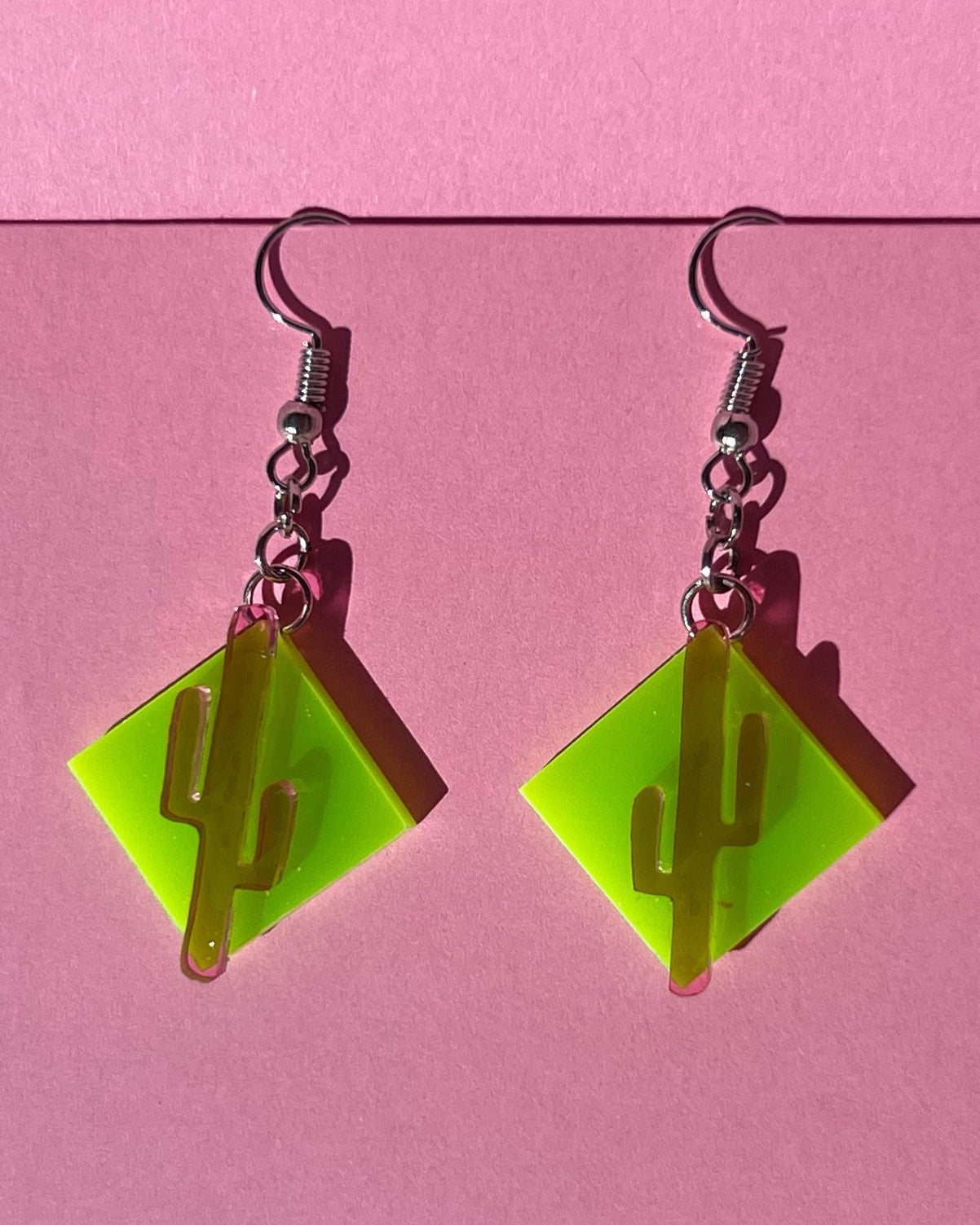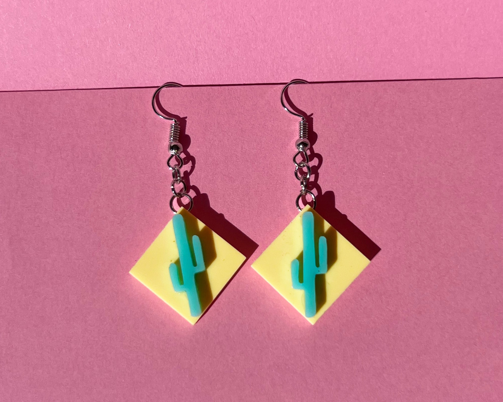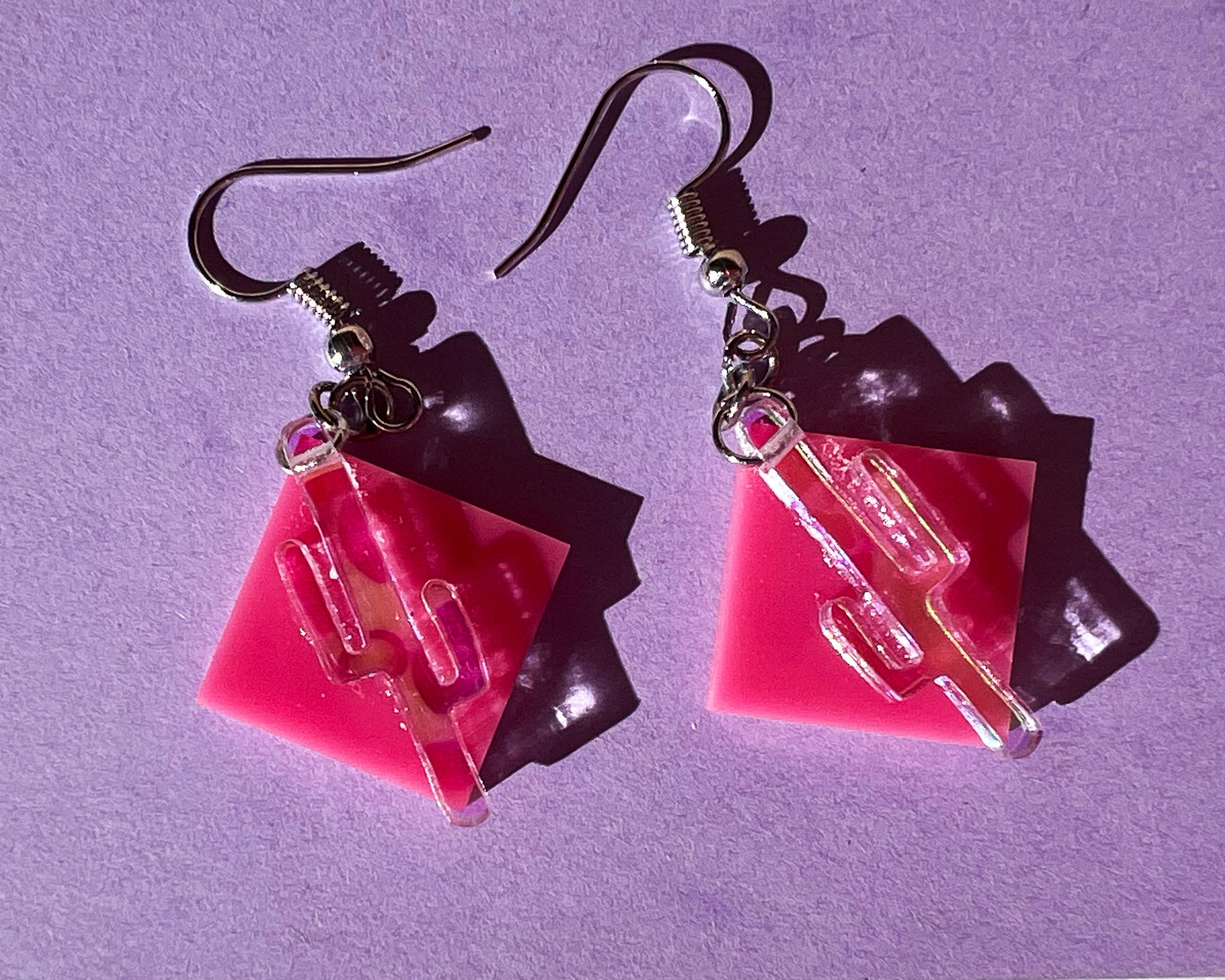 🌵 Layered lucite depicting a cactus with a sun or other sky element. Cacti are displayed on a mirrored or coloured or coloured translucent background.